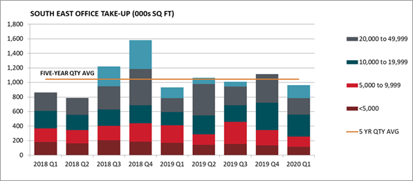 Across the 26 key South East markets, take-up amounted to 962,000 sq ft in Q1 2020, 8% below the five year quarterly average but, notably, 3% above than the same quarter in 2019. Take-up was given an air of respectability by the strong performance of a handful of markets, most notably Hammersmith & Chiswick, Milton Keynes, Woking and Guildford, with 20 of the markets seeing take-up in Q1 fall short of their respective five year trend levels.