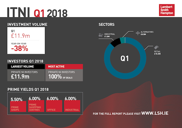 The Investment Transactions Northern Ireland Q1 2018 Bulletin recorded a completed transaction volume of £11.9m which is 85 per cent below the five-year quarterly average.