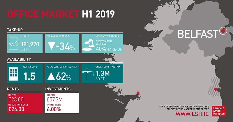 “Current construction of new and refurbished offices has peaked at 1.3m sq ft, of which two-thirds is speculative. Supply has been boosted by the commencement of the currently under construction Mercantile (73,000 sq ft) on Donegall Square South and the high quality refurbishment of the 37,000 sq ft The Kelvin (Stokes House) on College Square East, both due for completion in mid-2020.